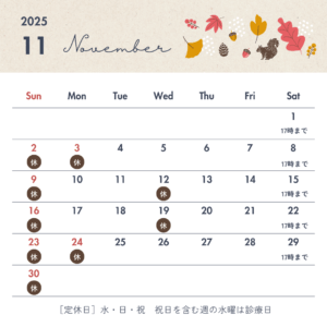11月3日、24日は祝日のため休診、振り替えで5日、26日が診療日となっております。